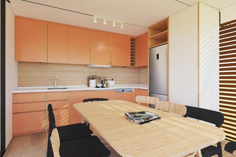 Bu modelde L planda 2 yatak odalı üniteyle bağımsız bir salon-mutfak ünitesi ortak bir terasta buluşuyor.